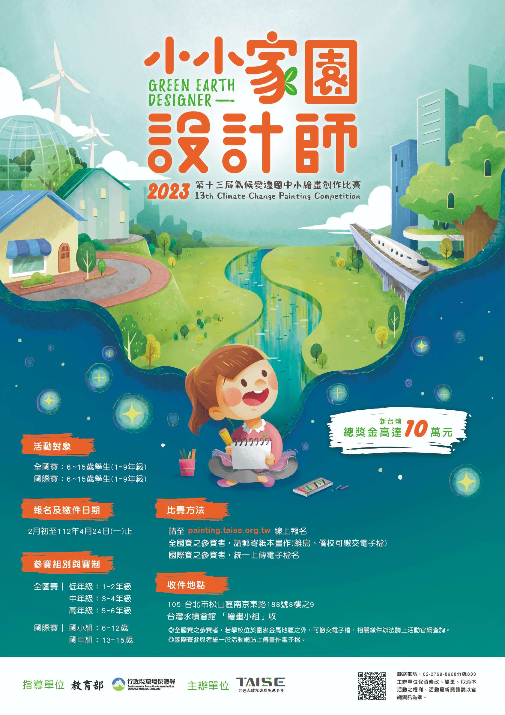 一、由教育部、行政院環境保護署指導,財團法人台灣永續基金會主辦之「氣候變遷國中小繪畫創作比賽」迄今已舉辦12屆,累計40國、 59,152名學子參與。本屆(第13屆)為呼應聯合國永續發展 目標(SDGs)的第11項,以「小小家園設計師」為主題,提升國中小師生關注天然災害對城市造成的損傷,思考如何 降低城市垃圾和空氣污染,同時重視社區文化與自然遺產等。此繪畫比賽也呼應第13項,採取氣候行動並提升大眾相關意識。