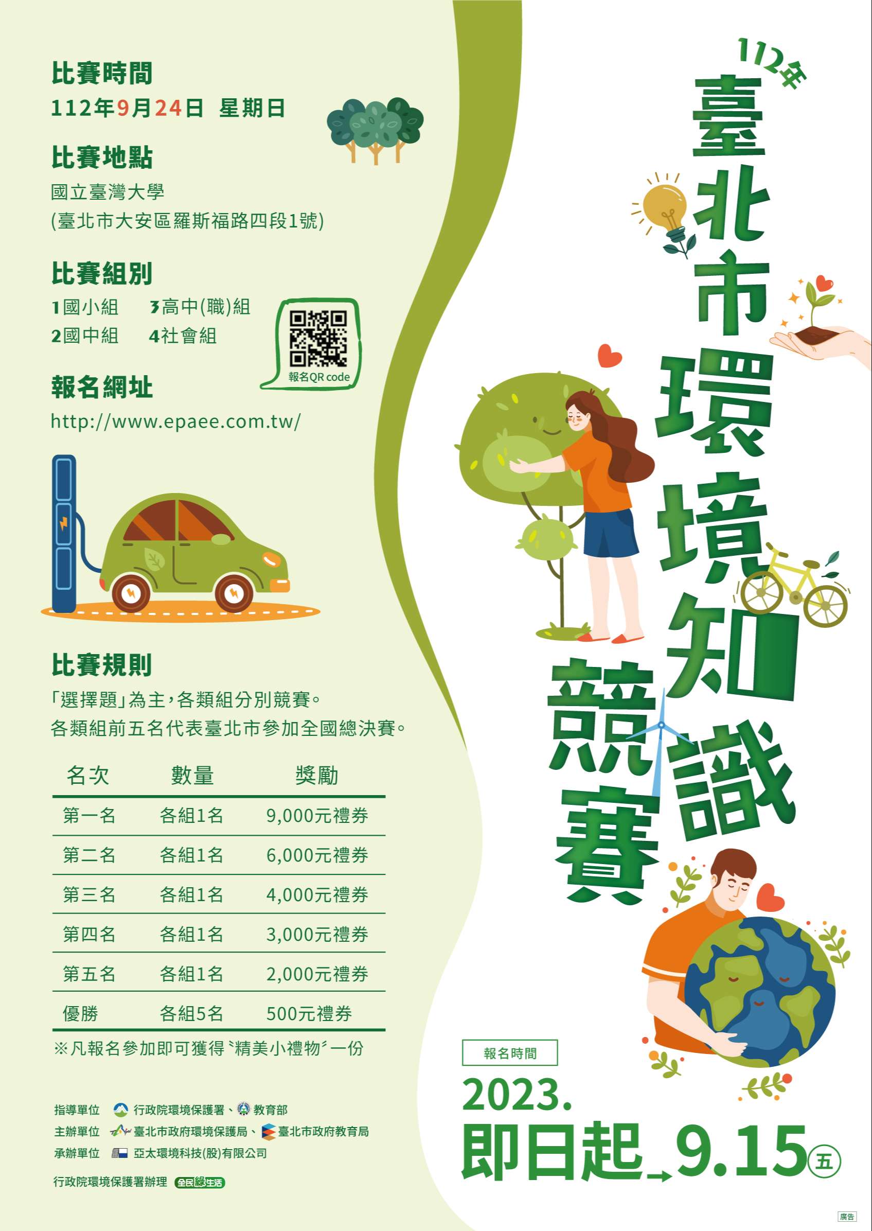 三、本市初賽各類組優勝前5名將代表本市參加行政院環境保護 署辦理之全國決賽,初賽各類組獎勵方法詳競賽須知。隨 文檢送競賽須知1份及海報1份(如附件),敬請協助公告 宣傳,有相關問題請洽本局彭國淵先生(電話:02-2720-8889分機7232),或洽本局委辦單位亞太環境科技公司呂 芷其小姐(電話:02-2218-9099分機233)。