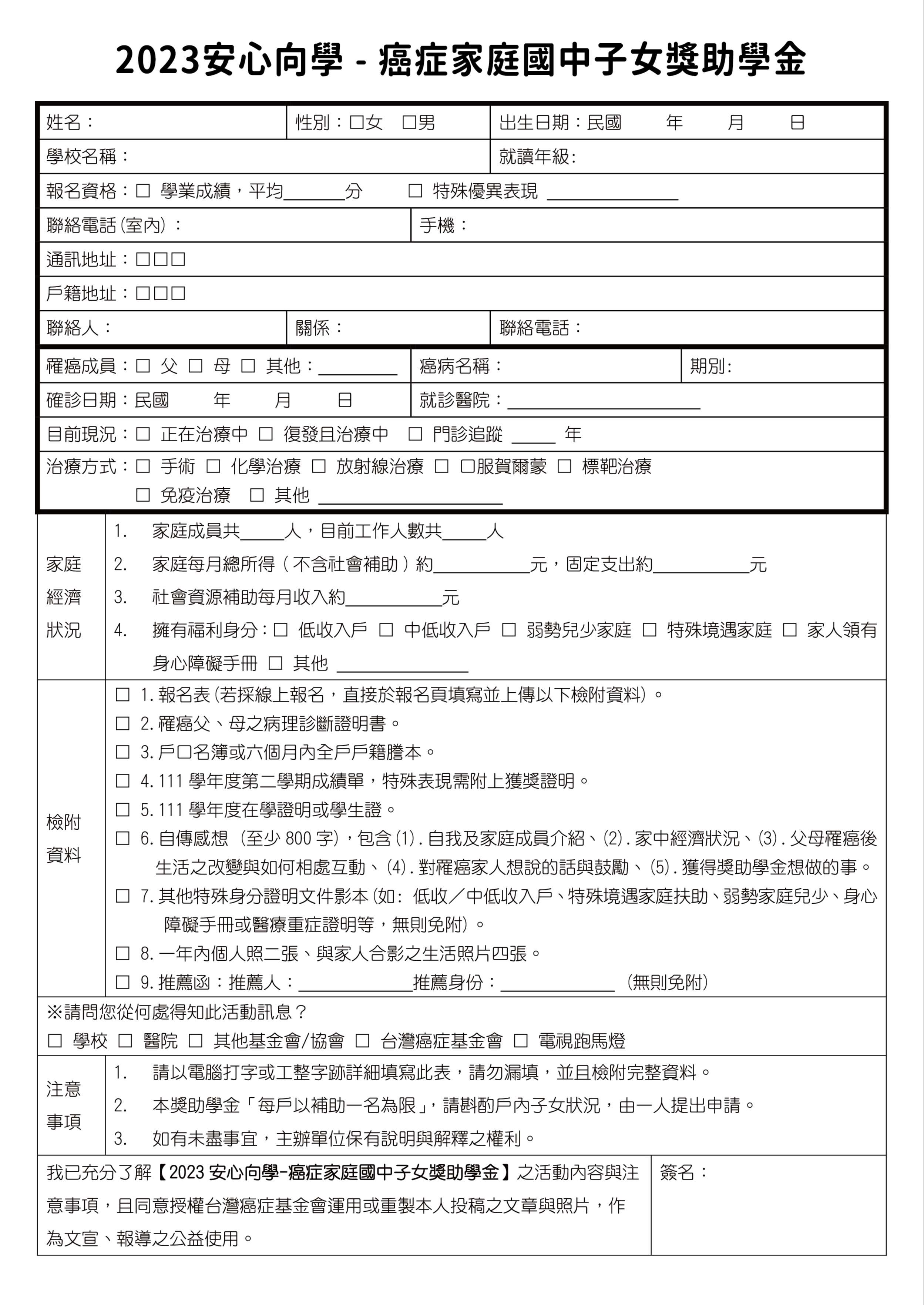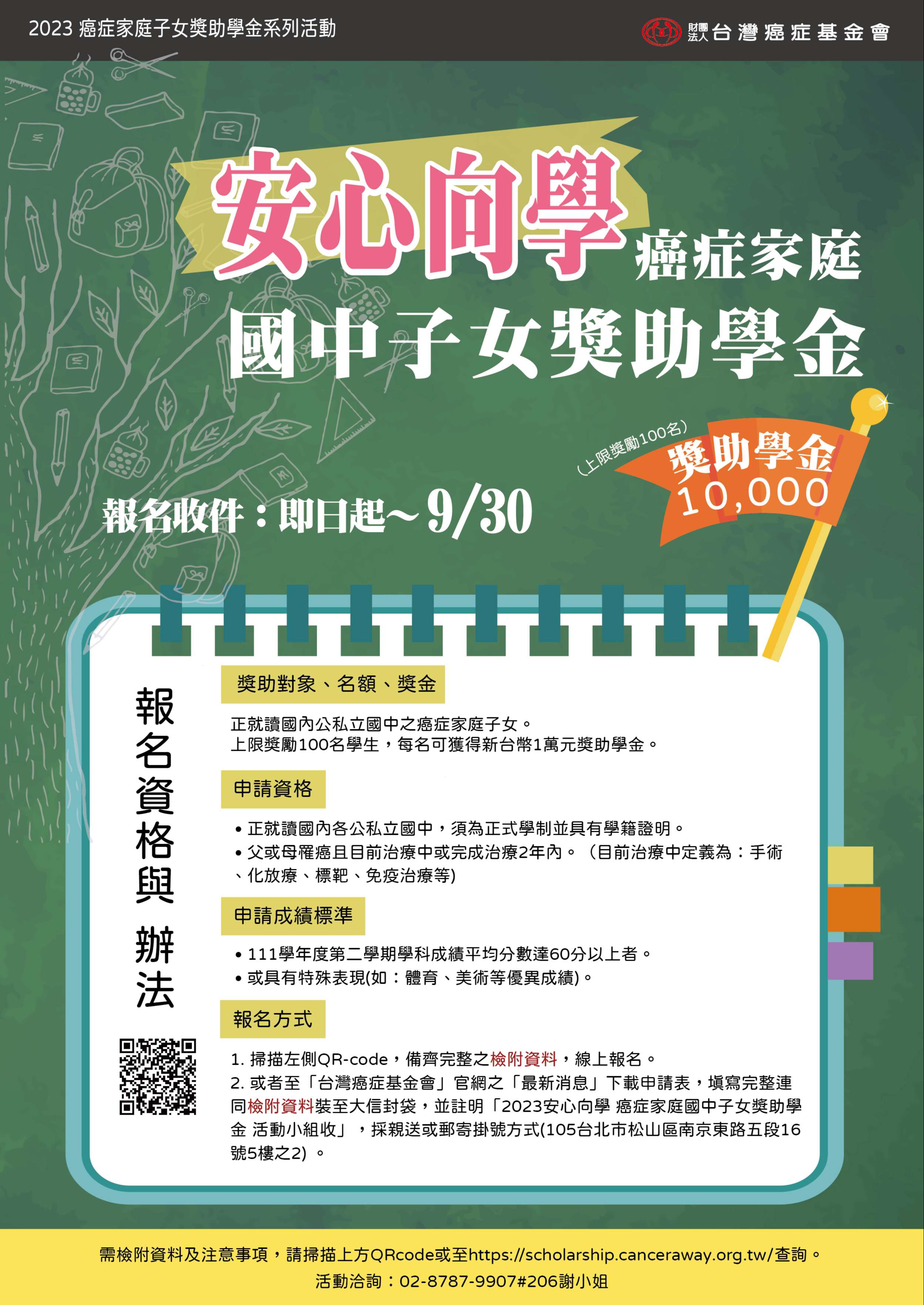 六、檢附「2023安心向學—癌症家庭國中子女獎助學金」活動海報、申請表及報名表各1份。