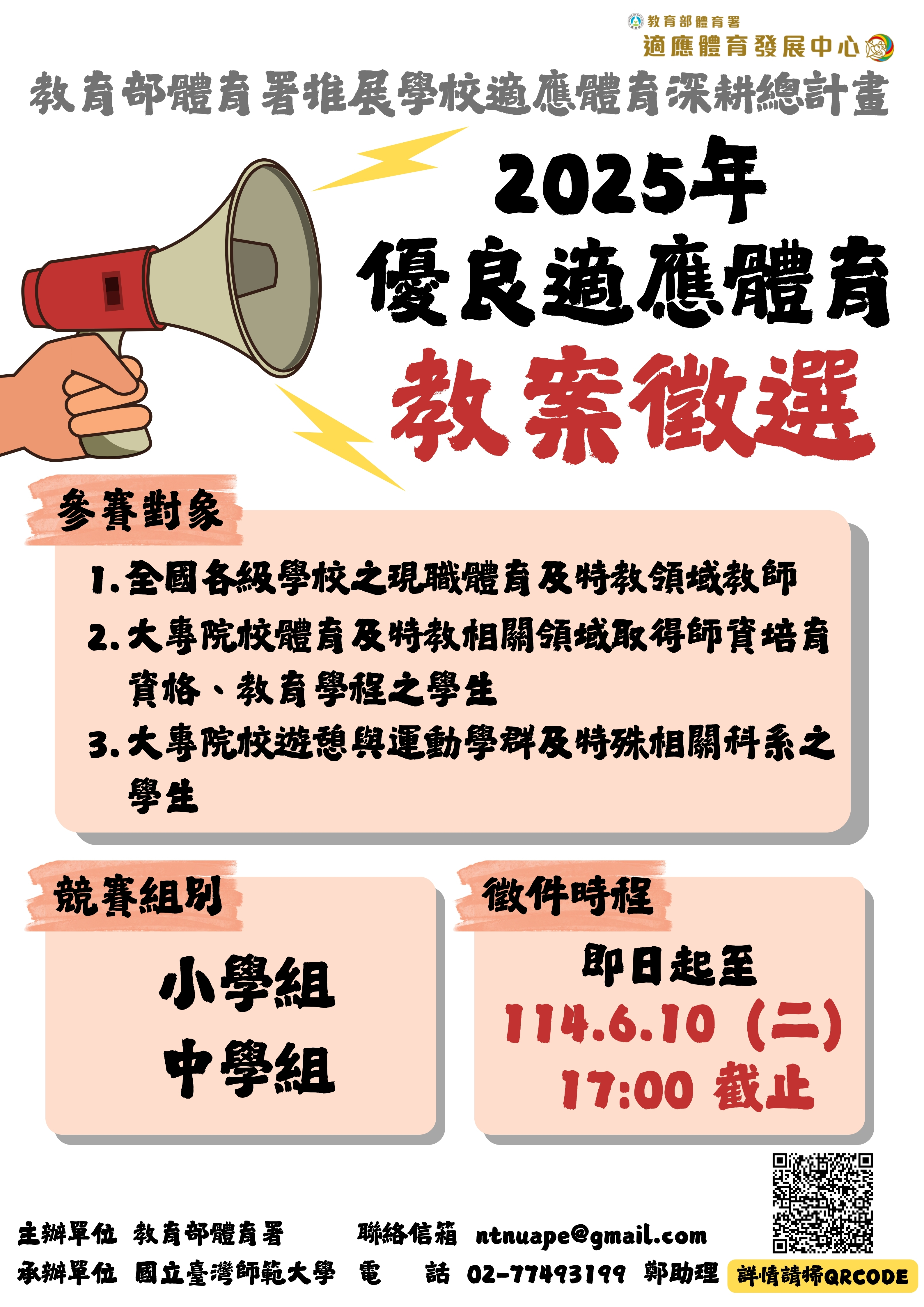 2025年優良適應體育教案徵選實施計畫簡章,詳如附件及海報資訊,敬請參閱。