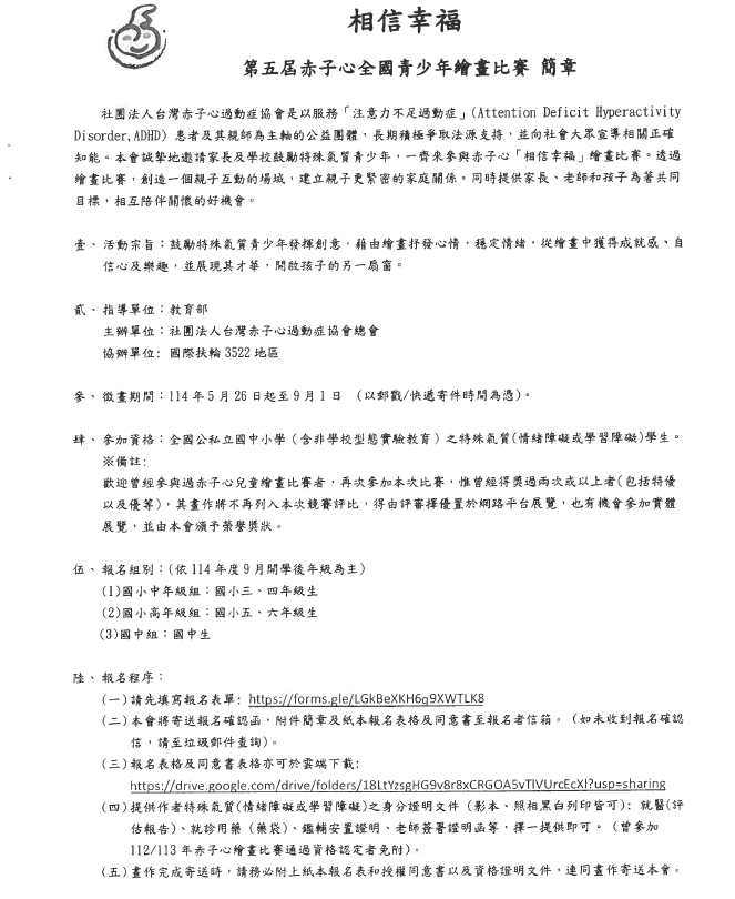 轉知社團法人台灣赤子心過動症協會辦理之「赤子心全國青少年繪畫比賽」,活動簡易資訊可參考下方圖檔,詳細資訊請詳閱附件檔案,敬請參閱。