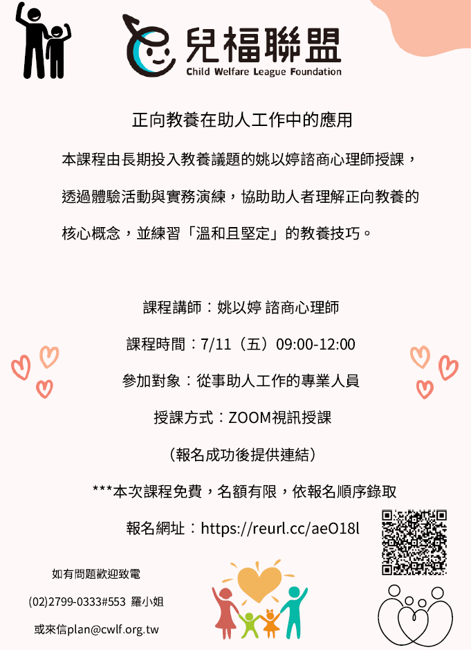 轉知兒福聯盟辦理「正向教養在助⼈⼯作中的應⽤」7/11(五)場次,活動詳情請見附件檔案,敬請參閱。