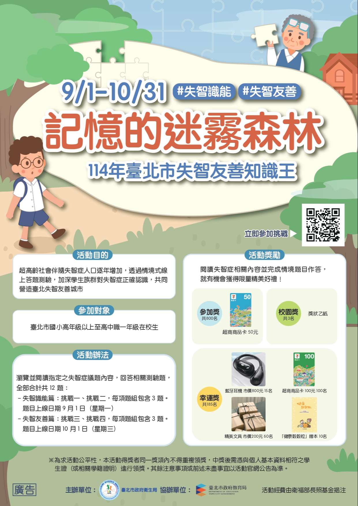 轉知臺北市政府衛生局辦理失智友善知識王活動-『記憶的迷霧森林(9/1~10/31)』,活動詳情詳附件(下方海報),敬請參閱。