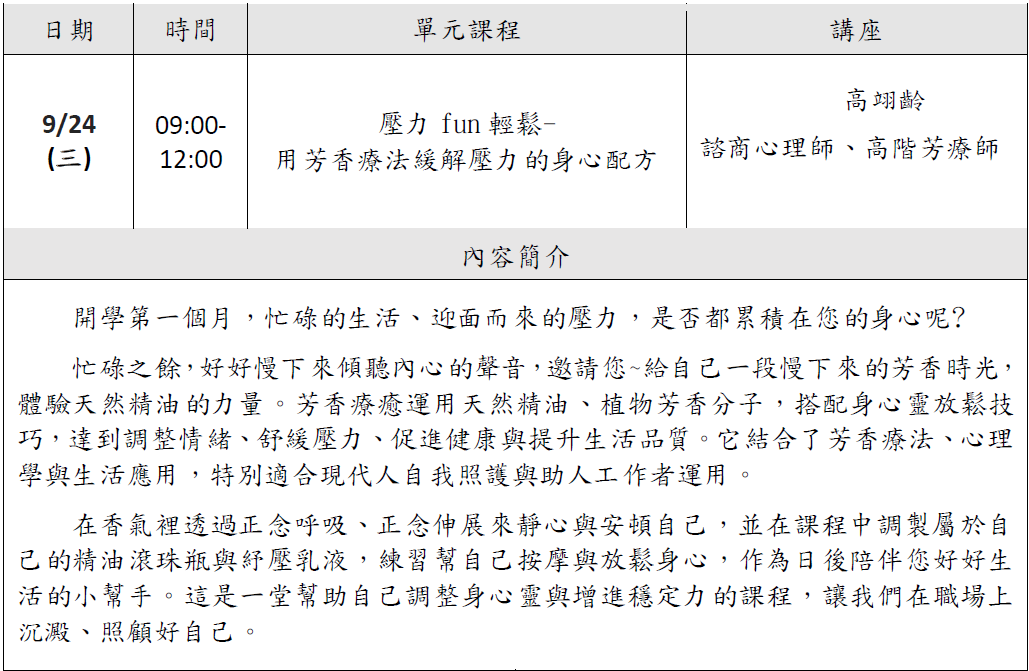 公告臺北市教師研習中心辦理-114年教師希望心坊(9月份)課程-『壓力fun輕鬆-用芳香療法緩解壓力的身心配方』,活動資訊如附件(摘要如下),敬請參閱。