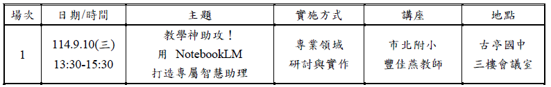 轉知台北市古亭國中辦理114學年度第1學期資優教學應用工作坊實施計畫(9/10),報名資訊及詳情請參考附件,敬請參閱。