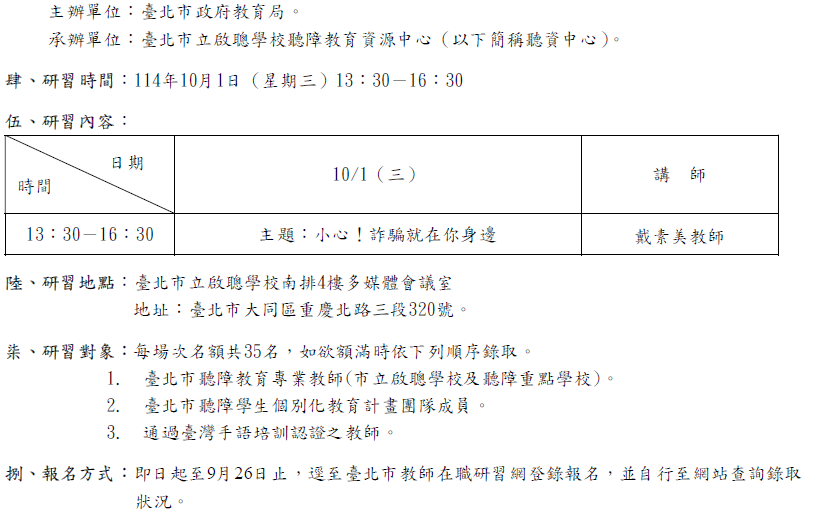 公告114學年度第1學期「手語能力精進」特教知能研習實施計畫,詳如說明,敬請參閱。