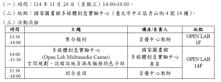 公告臺北市114學年度資優教育教師「多媒體創意實驗中心(OPEN LAB)」參訪活動實施計畫1份,詳如附件,敬請參閱。