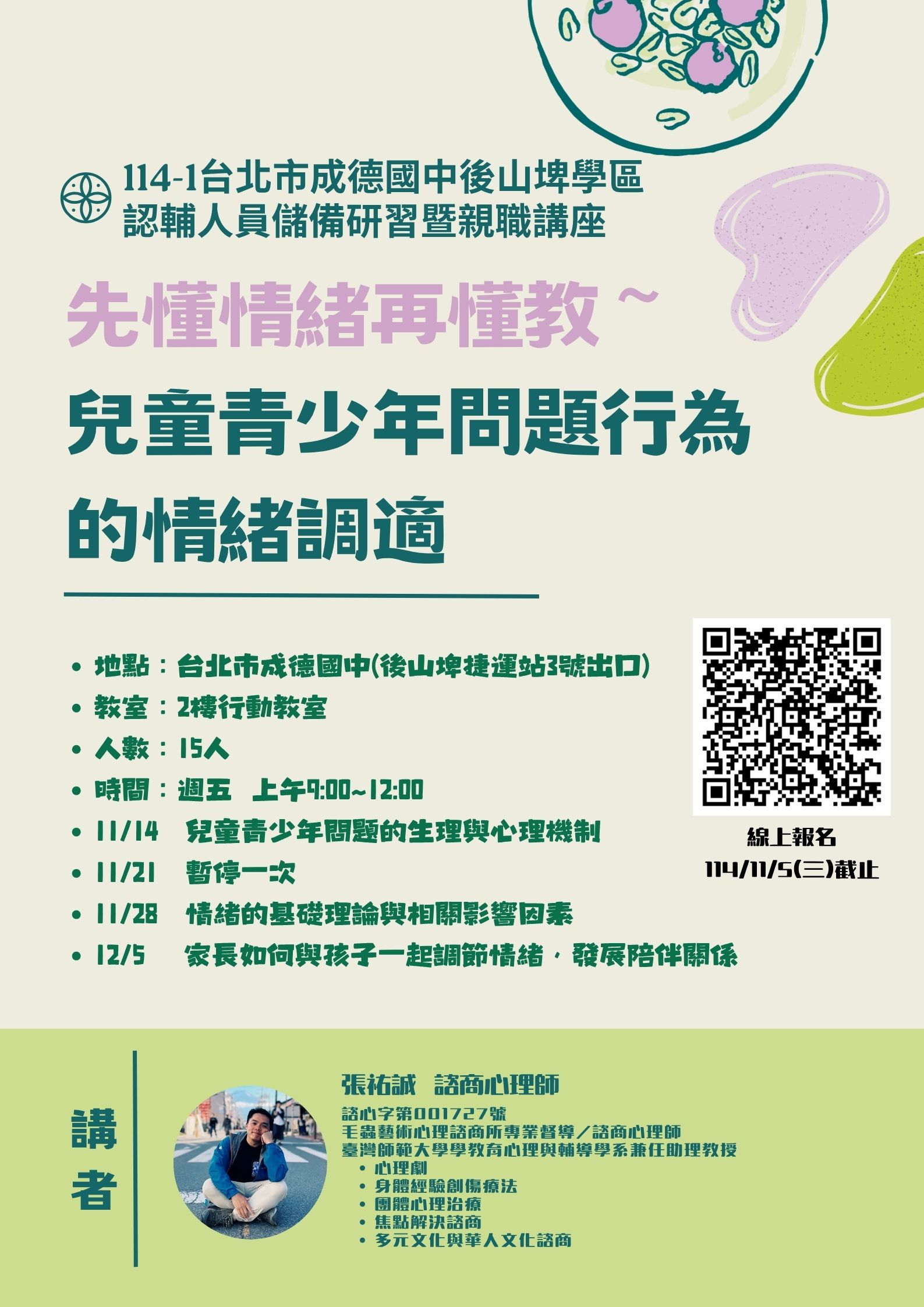 114學年度第一學期【台北市成德國中-後山埤學區】家長認輔人員儲備研習暨親職講座課程,