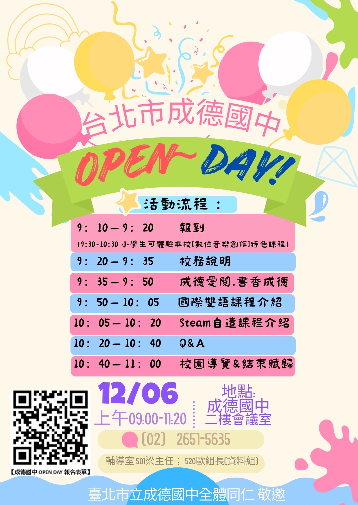 成德國中OPEN DAY將於114年12月6日盛大舉辦,誠摯邀請鄰近小學家長、學生踴躍報名參加。