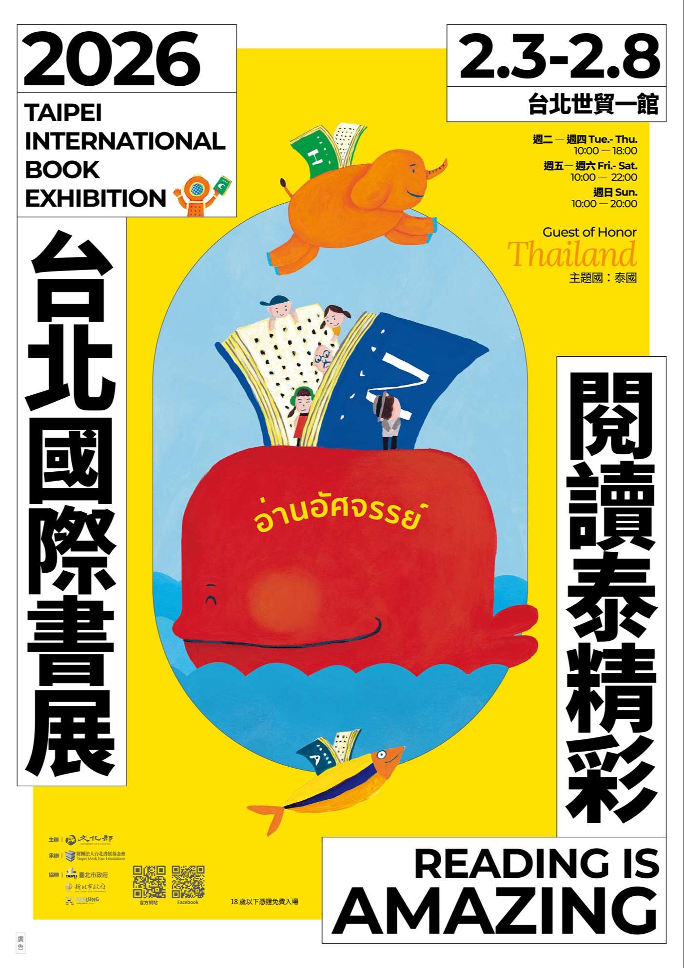 「2026年第34屆台北國際書展」訂於115年2月3日至2月8日於臺北市世貿一館1樓舉行,主題為「閱讀泰精彩,Reading is Amazing」,主題國為泰國。本屆書展規劃有綜合書區、國際書區、動漫輕小說區、童書區、數位出版及學習區、外文書區、公民書區及文學書區,並設有泰國主題國館、童書主題館、數位主題館、書展大賞館,未滿18歲之兒童及青少年憑證免票參觀。