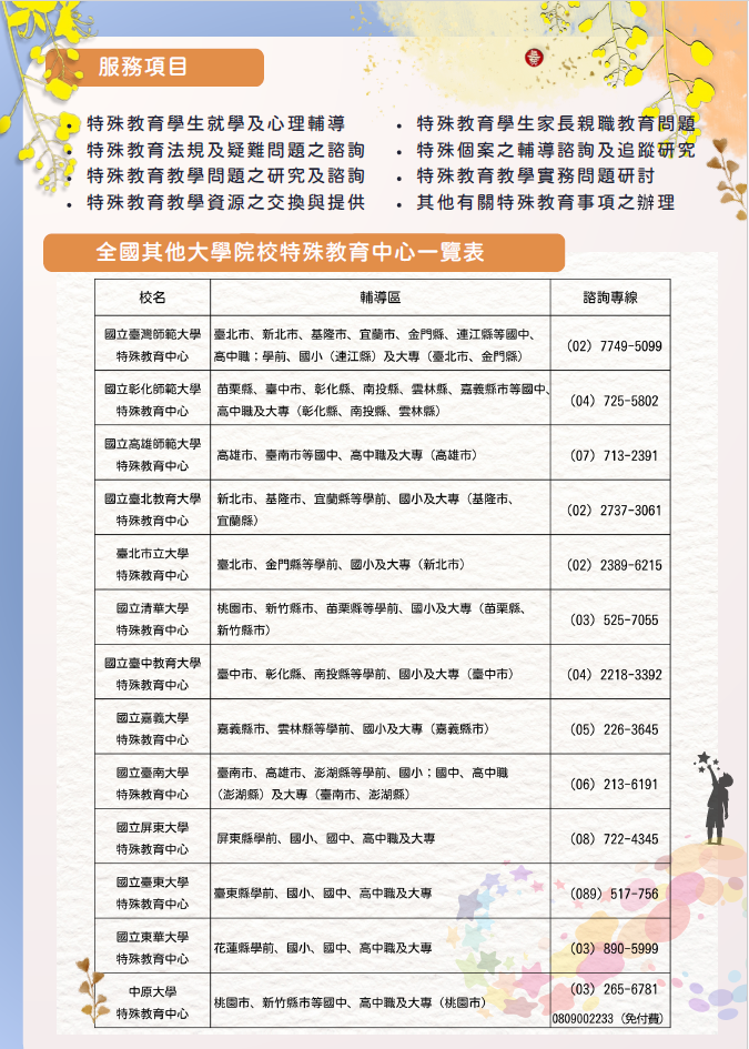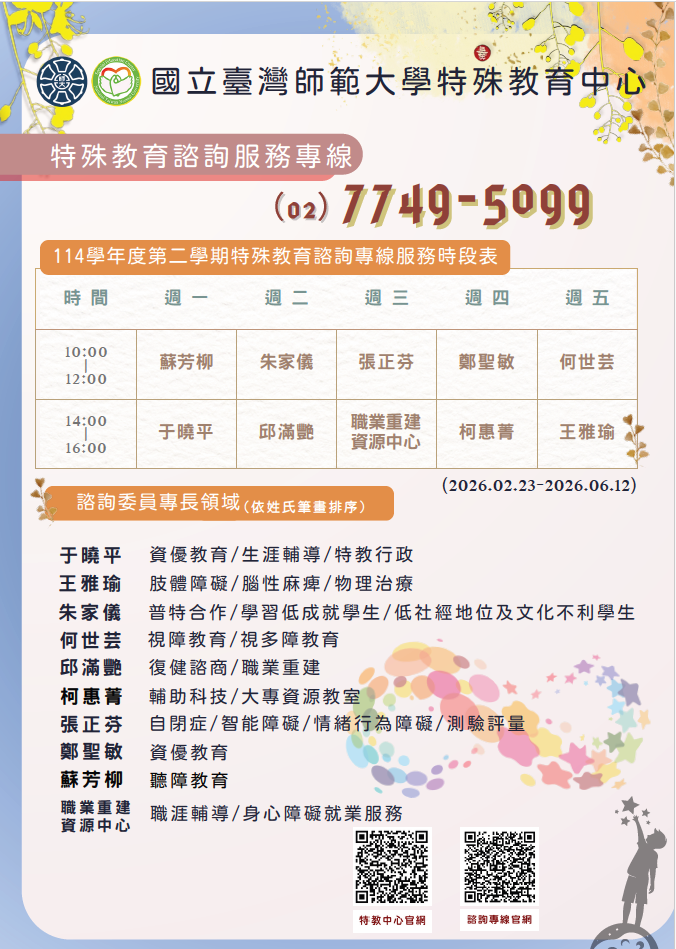 轉知台師大特教中心特教諮詢服務專線,詳如附件海報資訊,敬請參閱。